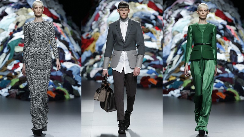 DIOGENES SYNDROME FW 2011: Vemos una apariencia de acumulación como reflejo de una sobrecarga mental, tal y como él mismo explicó en su día. Trozos de patrones sueltos, fieltro, líneas muy rectas…Algo retrofuturista inspirado en un tipo personajes de Star Trek y figuras geométricas cosidas sobre las prendas que nos llevan a películas de ciencia ficción con un punto retro. La escenografía alude a  Christian Boltansky y su pila de ropa amontonada.