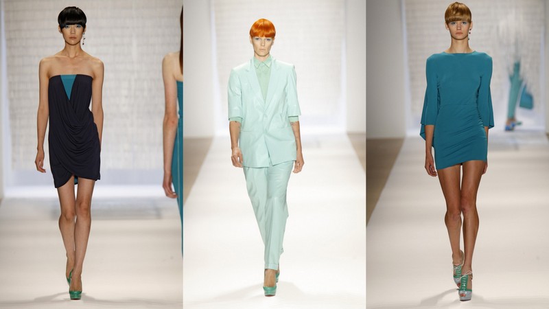 PLAYBACK SS 2010: Aquí el color aparece por primera vez de pleno, sin tímidos apuntes como había hecho antes. Ahora todas las tonalidades y matices de verdes y azules son combinados con blanco.  Esta colección tiene algo dadaísta en la mezcla de referencias muy dispares y algo absurdas que va desde la música con una primera canción que es “Trust in me” de El Libro de la Selva, de Walt Disney, y el segundo que es el “Ballet Mecanique”, una grabación original de 1925, también dadaísta. Al final suena la voz de Alaska. Y también vemos algo de lo absurdo en las prendas, en esos juegos de apariencias, el contraste de los colores y los materiales, pantalones que parecen cortos por delante y no lo son por detrás o la asimetría de las mangas.