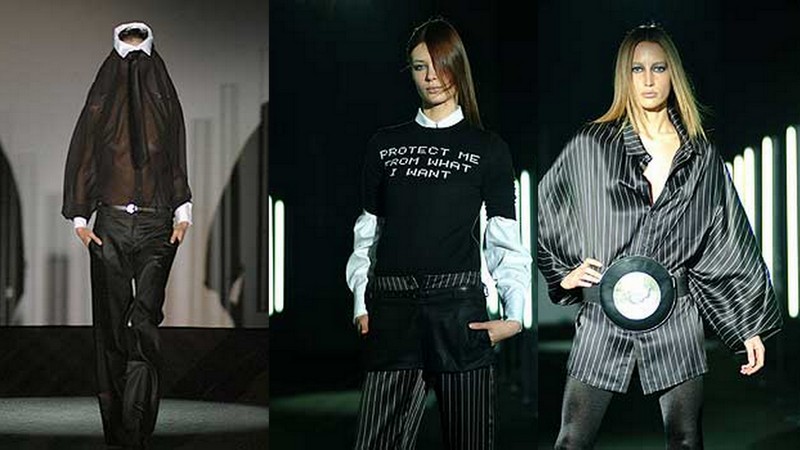 DUAL SS 2008: Aquí juega con la ambivalencia  en un escenario cuajado de cadenas  que nos sitúa en una especie de convento o de cárcel, simbolizando un lugar de recogimiento donde condensar los miedos y dolores que acechan. Una colección austera y sobria, con mensajes como “Hatred is blind” o “Each man kills the thing he loves” (frase que volverá a utilizar en clave sonora en “Tautology”). La dualidad se presenta en prendas con transparencias frente a la opacidad; las chaquetas desiguales; los vestidos que se transforman en pantalones; las faldas que se pegan al cuerpo en un lado y se disparan en el otro; las hombreras exteriores; o el chaqué puesto al revés. Los colores son los habituales aunque mete algo de verde. Los broches son muñecos de budú con alfiler incorporado. También aparece un modelo con el rostro vendado tipo El hombre invisible.