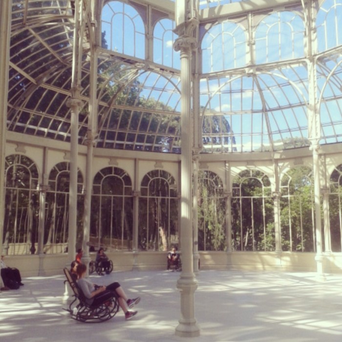 I can´t see any book and only a few rocking chairs, so I check my phone and google Dominique Gonzalez-Foerster, who is she? what is this showcase doing at the Palacio de Cristal – Parque del Retiro? and why the review talks about a selection of writers to enjoy whilst experiencing the performance. Nobody is reading.