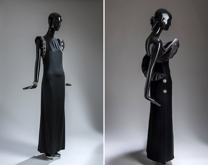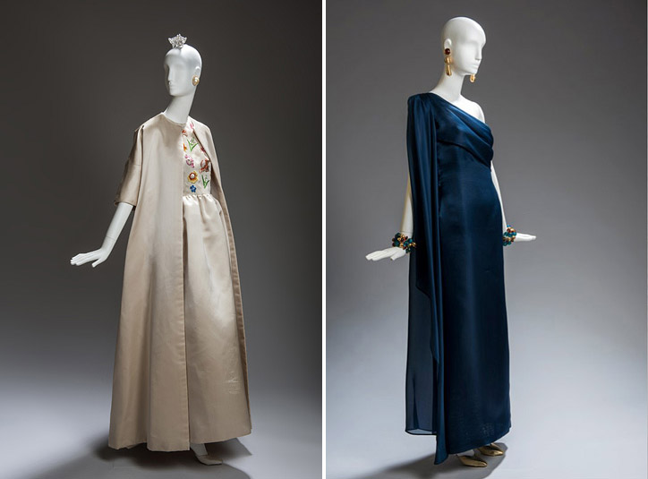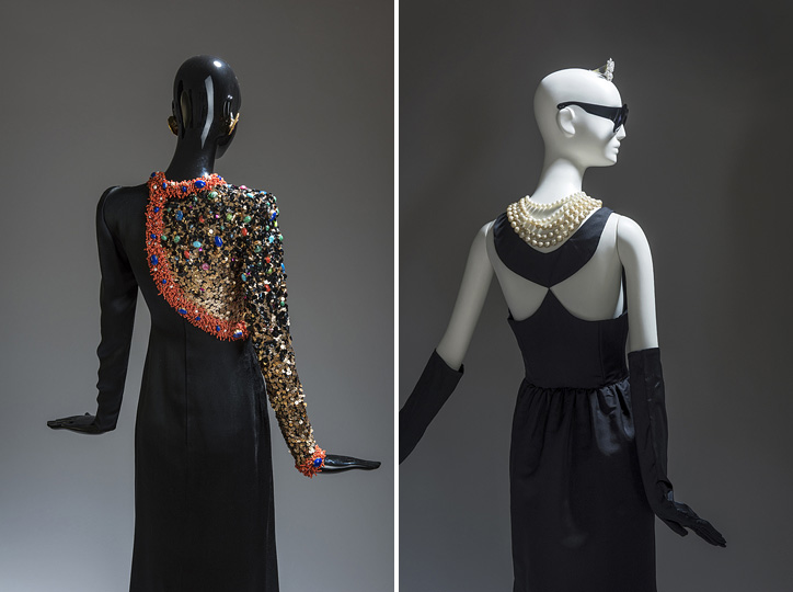 Esa pureza de líneas y volúmenes así como la modernidad de sus creaciones, apuntan a Balenciaga cuyas referencias son una constante a lo largo de la exposición, tal y como se refleja en una selección de Little Black Dress de finales de los 60-70, y en un conjunto de noche de pantalón y chaqueta en lamé brocado con galones de oro y nácar en los bolsillos, destacando esa importancia de los tejidos y los materiales en la construcción de sus piezas. El color y la introducción del patchwork en la alta costuratambién están presentes en las salas del museo, donde podemos ver varias chaquetas bordadas con fragmentos de tejidos de distintos estampados y materiales como plástico, rafia o cabujones de bisutería.