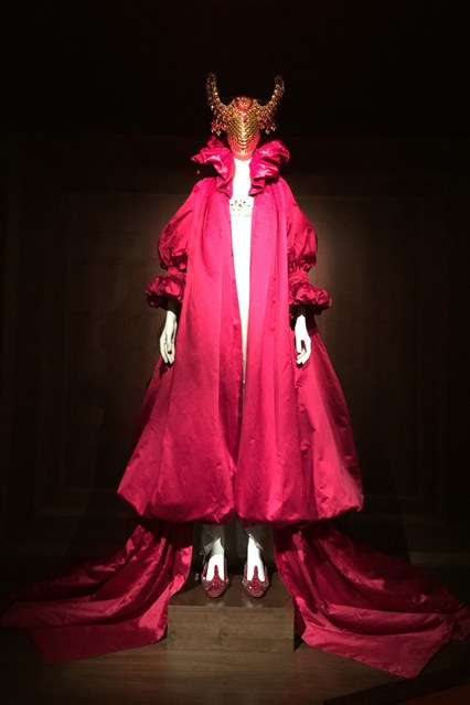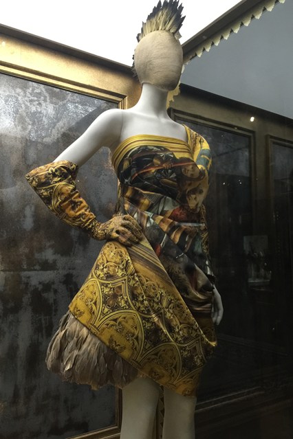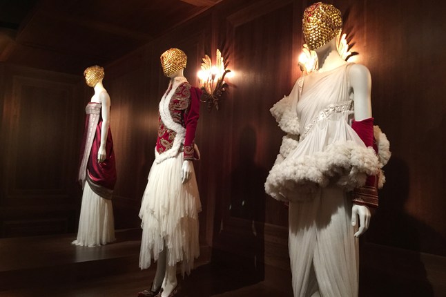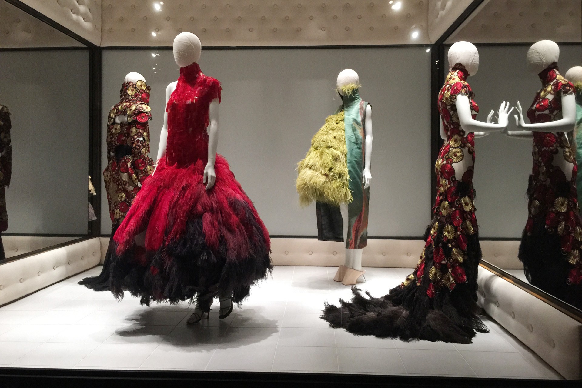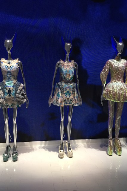 La puesta en escena de la exposición del Victoria & Albert Museum, inyecta esa misma esencia que el modisto solía recrear inspirándose en el cine, el arte y la fotografía. A lo largo del recorrido, encontramos proyecciones que recogen aquellos shows algo metafóricos y alucinógenos, llenos de recursos líricos y excesivos. McQueen representaba cada colección imponiendo su estética y su universo al margen de cualquier convencionalismo, creando situaciones inverosímiles, evocando vivencias oníricas y recuperando la teatralidad en cada desfile. Consideraba el cuerpo como un elemento controvertido, y se planteaba la normalidad frente al espectáculo de lo marginal en el que se recreaba. Su inagotable imaginación, creó una auténtica iconografía de amazonas, pájaros, mariposas, calaveras, escoceses, piratas, serpientes, diosas, mártires…de manera que sus desfiles, con la colaboración de artistas británicos de vanguardia, resultaban impactantes.