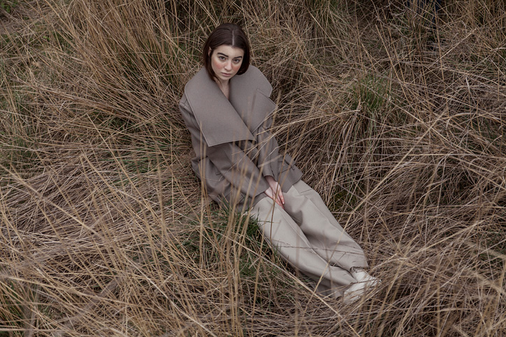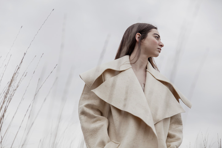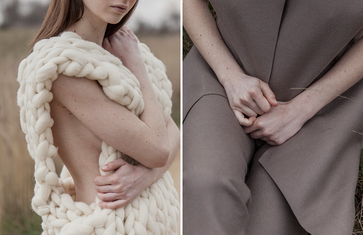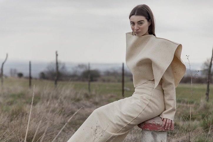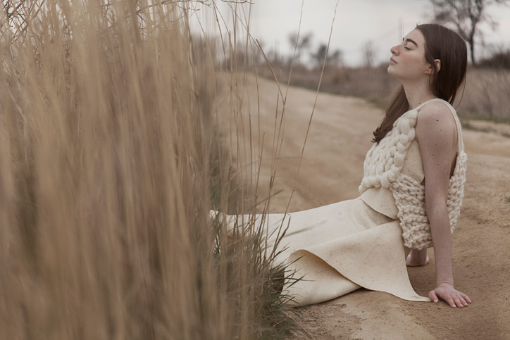 La colección se basa en un único material, la lana de merino. Esta vez he trabajado en la manipulación y experimentación del mismo material como el fieltrado, prensado, vellón de lana y mecha natural para crear texturas asombrosas, que se ve compensando con distintos grosores y técnicas diferentes a la hora de tejer la lana.
